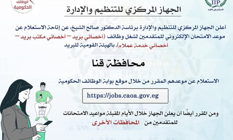 الجهاز المركزي يعلن عن اتاحة الاستعلام عن موعد امتحانات البريد بمحافظة قنا