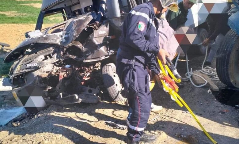 في إصطدام ما بين شاحنة لنقل الماء و سيارة نفعية على مستوى الطريق الوطني رقم 60 بمخرج سيدي عيسى بإتجاه شنيقل.