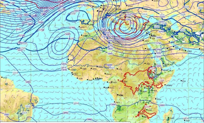 تمركز منخفض سطحي متعمق يرافقه منخفض في طبقات الجو العليا على جنوب أوروبا ويكون تأثيره على بلادنا هو الرياح الجنوبية الغربية التي تنشط مثيرة للرمال والأتربة على السواحل الشمالية الغربية والصحراء الغربية والمناطق المكشوفة من القاهرة الكبرى والوجه البحري.