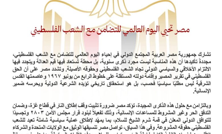 تشارك جمهورية مصر العربية المجتمع الدولي في إحياء اليوم العالمي للتضامن مع الشعب الفلسطيني مجددة تأكيدها أن هذه المناسبة ليست مجرد ذكرى سنوية، بل محطة تستعاد فيها قيم العدالة ويتجدد فيها الالتزام الأخلاقي والسياسي الدولي تجاه الشعب الفلسطيني وحقوقه الأصيلة. وتشدد مصر على أن الحق الفلسطيني في تقرير المصير وإقامة دولته المستقلة على خطوط الرابع من يونيو ١٩٦٧ وعاصمتها القدس الشرقية ليس مطلبًا سياسيا فحسب، بل هو استحقاق تاريخي تؤيده الشرعية الدولية ويحرسه ضمير الإنسانية.