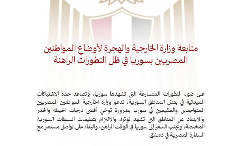 وزارة الخارجية تتابع أوضاع المواطنين المصريين بسوريا في ظل التطورات الراهنة