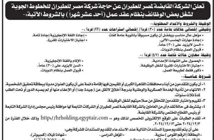وظائف مصر للطيران للخدمات الجوية ومصر للطيران للسياحة والأسواق الحرة