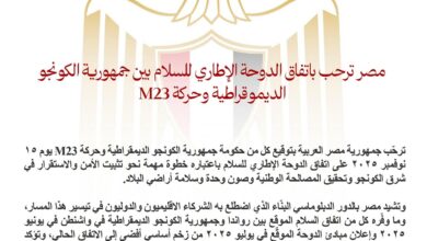 كتبت : نهى رسلان الحجازي ترحّب جمهورية مصر العربية بتوقيع كل من حكومة جمهورية الكونجو الديمقراطية وحركة M23 يوم ١٥…